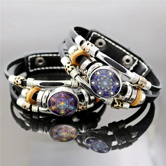 Bracelet Vintage mystérieux Cube Metatron, géométrie sacrée, fleur de vie, bouton-pression, multicouche, Punk, en cuir, vente en gros