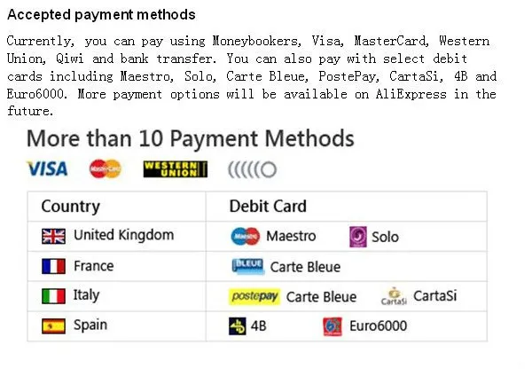 B : Actuellement, vous pouvez payer par Moneybookers, Visa, MasterCard et par virement bancaire.Vous pouvez également payer avec certaines cartes de débit, notamment Maestro, Solo, Carte Bleue, PostePay, CartaSi, 4B et Euro6000.D'autres options de paiement seront disponibles sur AliExpress à l'avenir