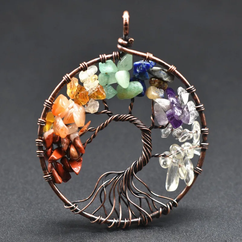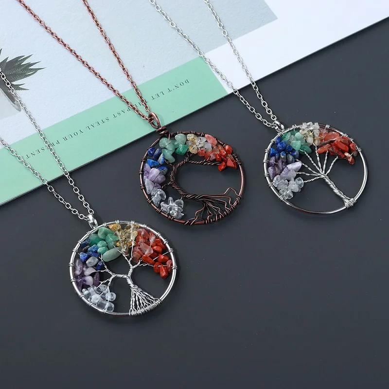 Collier pendentif arbre de vie en pierre de cristal naturel, 7 chakras, Quartz, améthyste, bijoux de mariage pour femmes